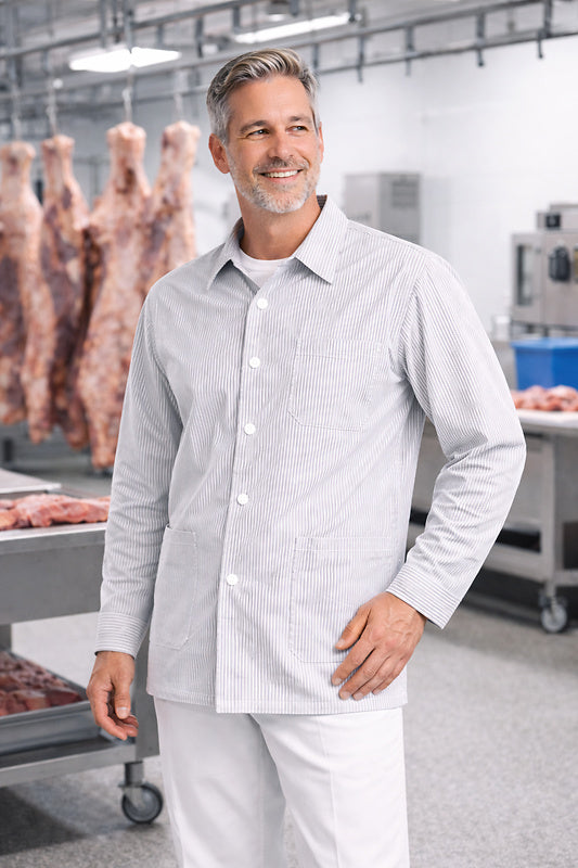 Durch das schlichte Design ist diese günstige Fleischerjacke ideal für Metzgereien, Fleischereien sowie für den Einsatz in Produktion, Verkauf und Verarbeitung geeignet. Die hochwertige Verarbeitung sorgt für eine lange Lebensdauer – auch bei intensiver Nutzung.