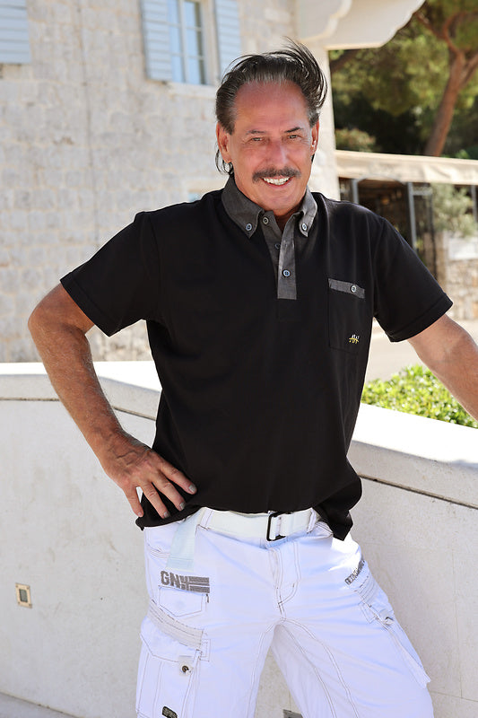 Our performance polo shirt Luan, made from iron-free and easy-care waffle pique, is breathable, and the fabric has been coated with silver ions to neutralize odors and provide an antibacterial effect. This means sweat has no chance, and you feel completely comfortable all day long. The entirely black polo shirt features many beautiful accents made from high-quality denim fabric! These include the placket, which is fitted with three stainless steel buttons, and the button-down collar, where the collar tips are each fastened with a stainless steel button. The chest pocket has a denim trim and a decorative button with no function. The chic AW logo has been lovingly embroidered with elegant silver and gold thread.